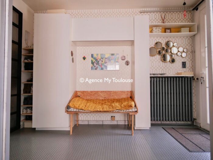 L’entrée donne le ton : lumineuse, fonctionnelle, avec un millier de petites attentions faîtes maison. C’est une maison de famille, et ça se sent. Beaucoup de rangements sur mesure, des portes coulissantes modulent les espaces et rendent fluides les circulations.
