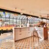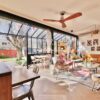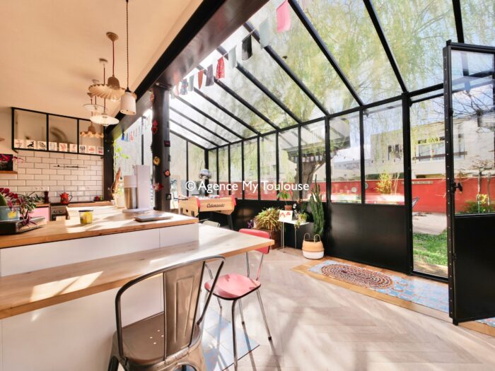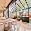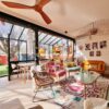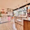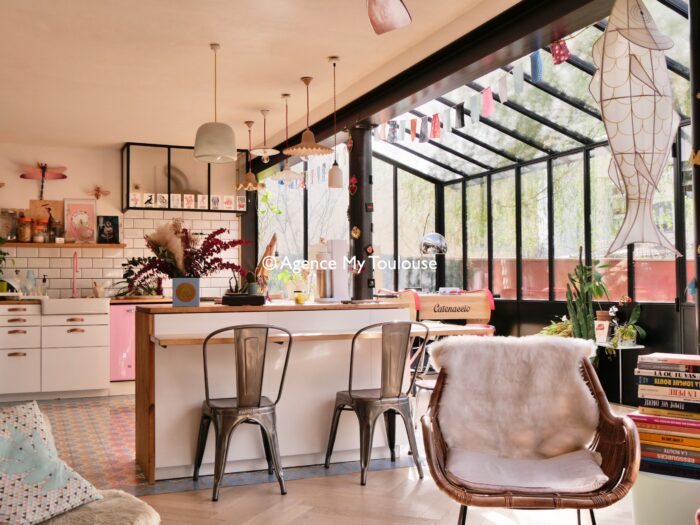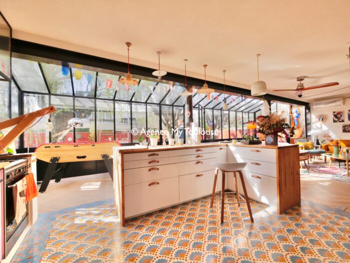 Véritable jardin d’hiver, la lumière est omniprésente, les espaces de vie débordent de couleurs, de motifs et de textures. La cuisine, ouverte, équipée d’électroménager haut-de-gamme et pourvue d’une arrière cuisine pour les aspects les plus techniques, est délimitée par un grand comptoir invitant à la convivialité.