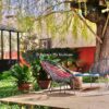 La façade côté rue mise sur la discrétion et joue avec ombres et lumières grâce aux lignes verticales d’un moucharabieh contemporain, qui tamise la lumière intérieure et procure de l’intimité, à l’ombre des jasmins et des bougainvilliers.