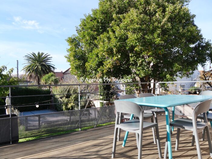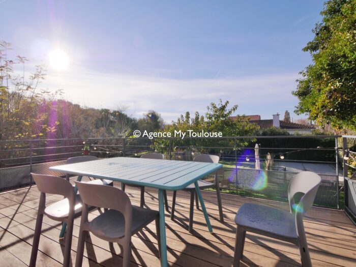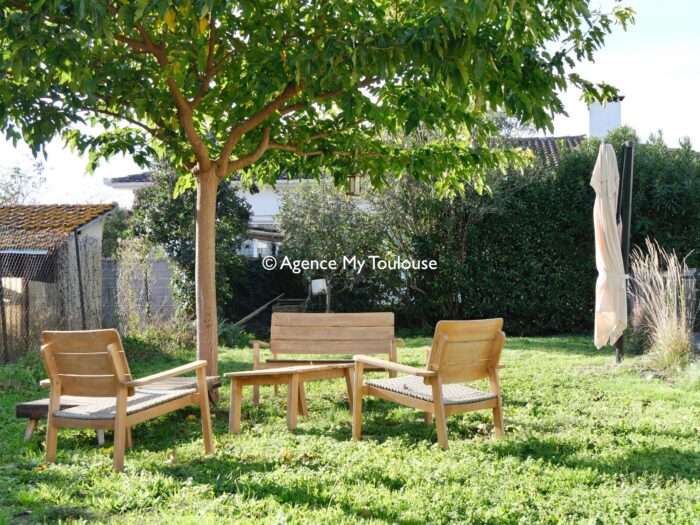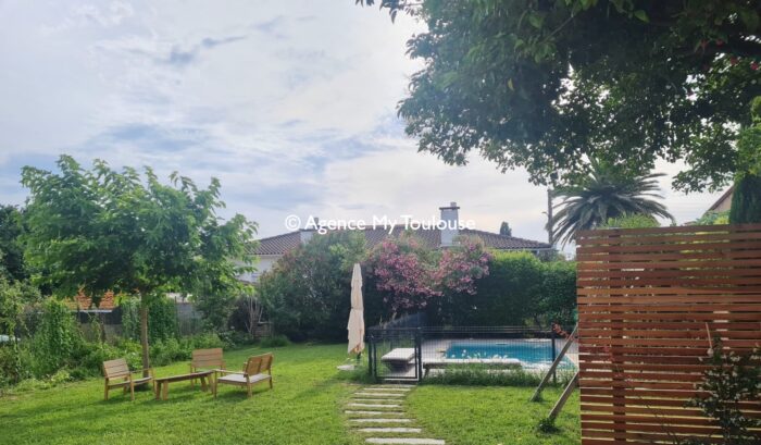 Maison familiale T5 avec prestations qualitatives, disposant d'un jardin avec terrasse et piscine.